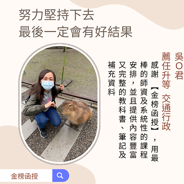 最後也要感謝的是 【金榜函授】,用最棒的師資及系統性的課程安排,並且提供內容豐富又完整的教科書、筆記及補充資料等,在最短時間內讓我能掌握住沒接觸過的考試科目,另外線上課程也能彈性配合我零碎的讀書時間,真心推薦給想準備考試但在職中的人,準備考試的路真的很辛苦,但最重要的就是努力堅持下去,最後一定會有好結果,與大家共勉之!